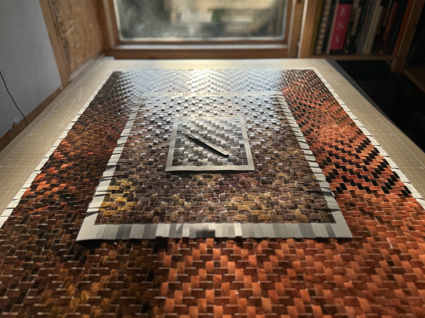 Here is a preview of my largest scale weave in this series, only the second produced at this size, measuring 28.5 x 37.5 inches (72 x 95 cm). I want to create more. I love the play of the pattern and image at different scales.