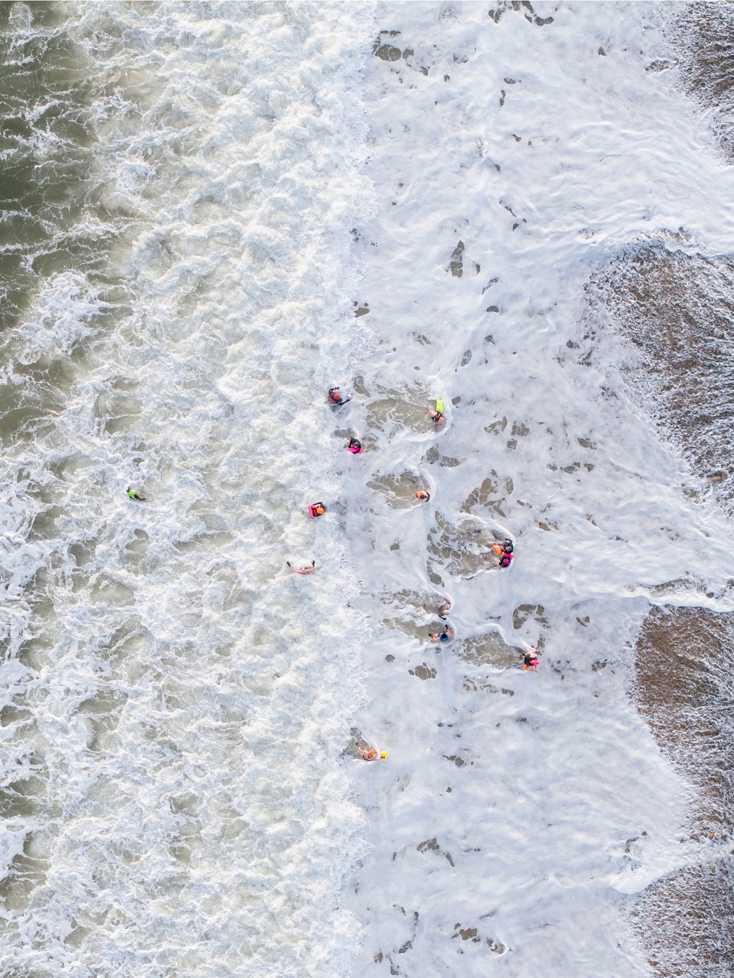 After the service, I stare in awe at the foaming surf. Cars arrive. Women jump out, a pod of neoprened and bare-limbed selkie queens, majestic dry robes flowing around them, a latex flamingo crowning a head. They shriek with delight as cold water overwhelms them. The rolling boil is a place of recreation, for pleasure, for awe.