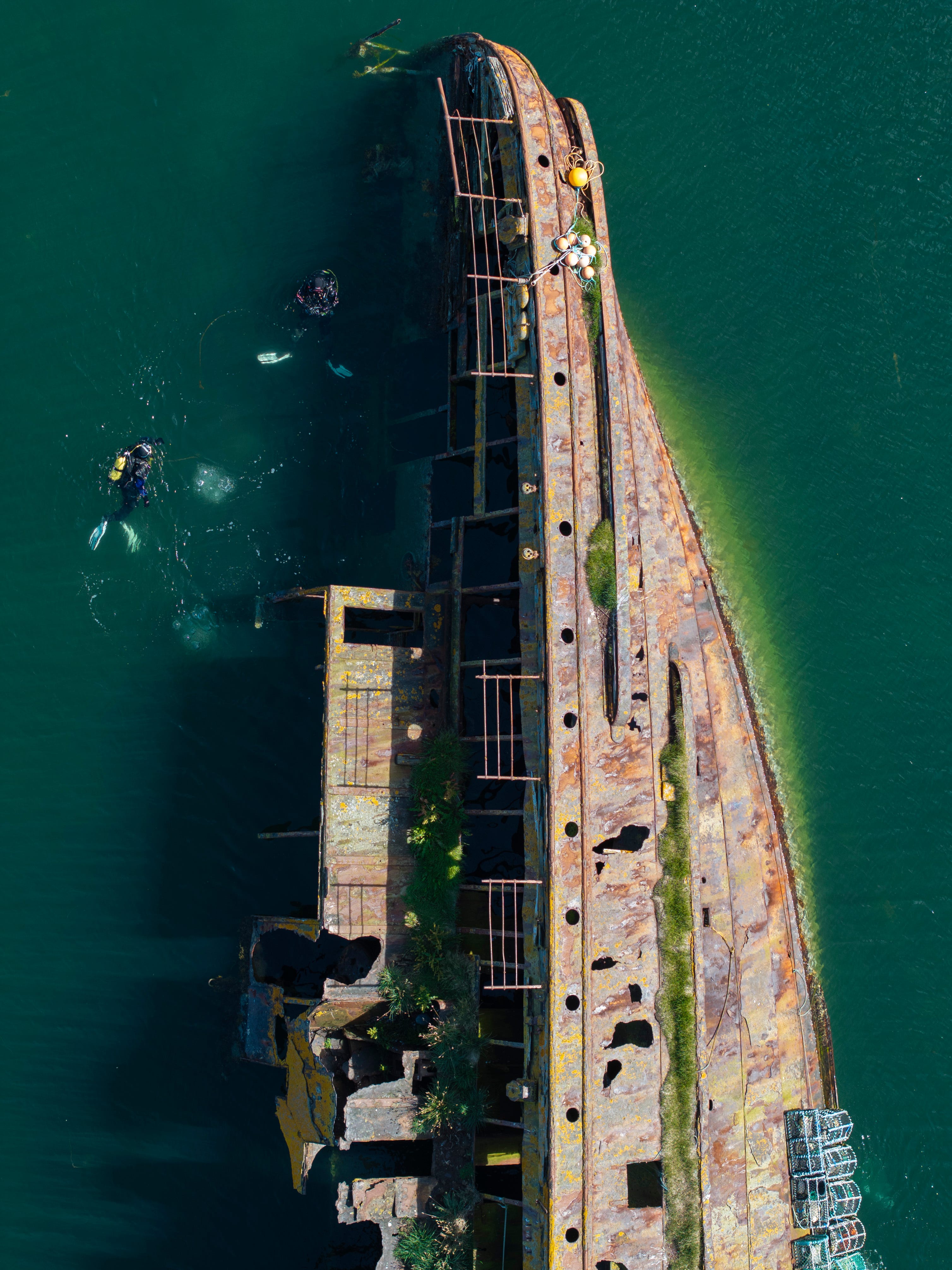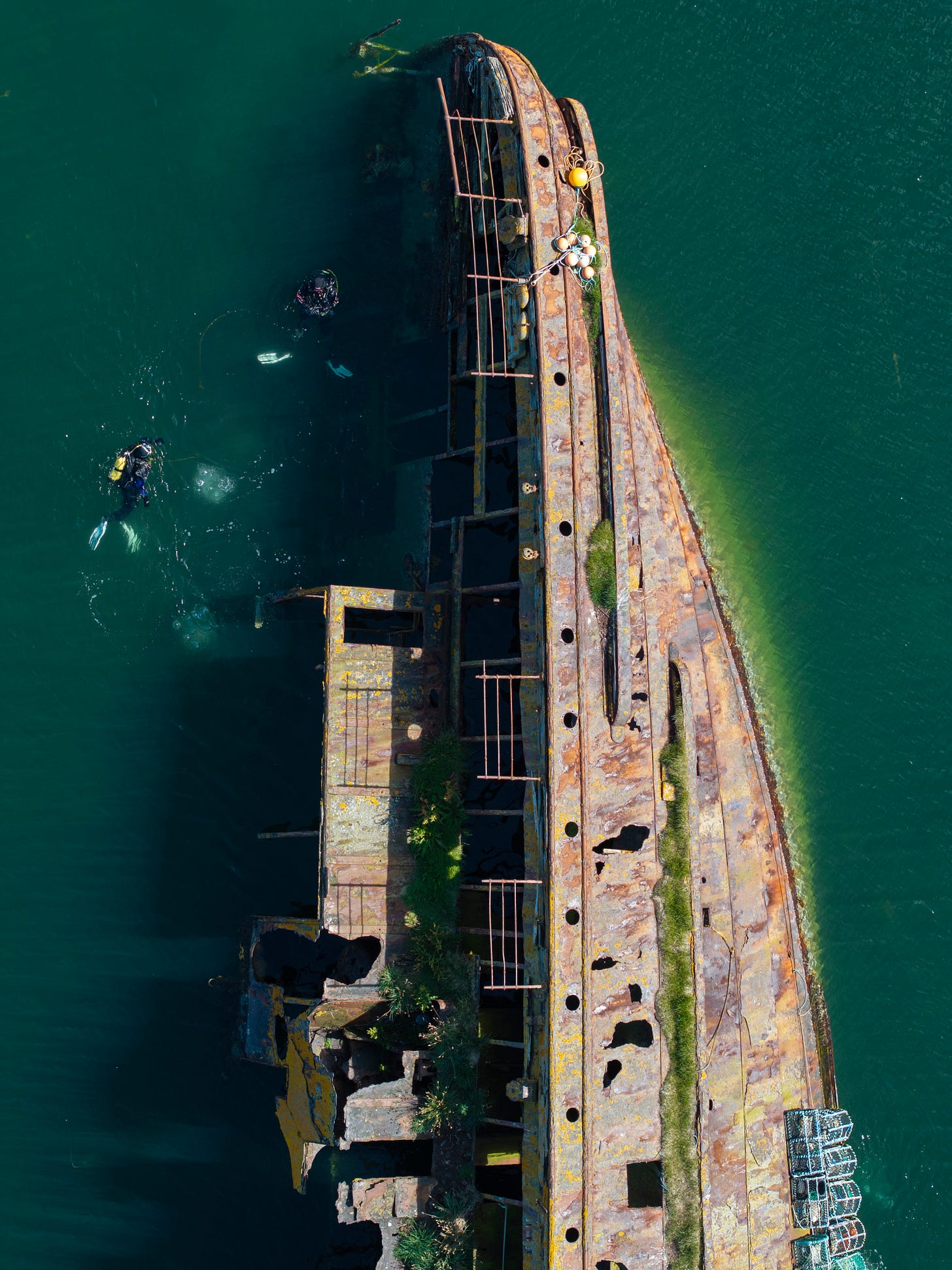 I took Ada for a cake then suggested visiting a shipwreck. She loved the idea. The light was bright, just what we needed for a good drone shot, with the intense afternoon rays illuminating the turquoise waters. The wrecks were sunk during WWII to block sneaky German U-boats from slipping between islands to blow up the North Atlantic fleet harboured in Scapa Flow. When the Churchill barriers were constructed by Italian POWs, they left the ships in place.